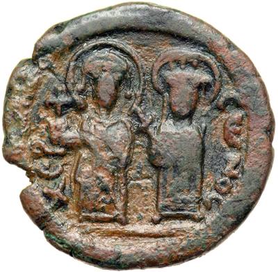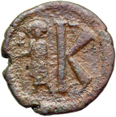 Byzantine Empire. MAURICE TIBERIUS WITH CONSTANTINA AND THEODOSIUS, half follis or 20 nummi (6.68 grams), Cherson, 590-6. C C, Maurice and the Empress Constantina, both nimbate, stg. facing side by side, the emperor holding gl. cr., the empress cruciform scepter. Rev. Large K to l. of which stands Theodosius, nimbate, facing, holding P-headed cross. DOC 298 = Tolstoi 329; MIB 162; Sear 608. V. Very Fine/fine and extremely rare, possibly only the third known specimen.
