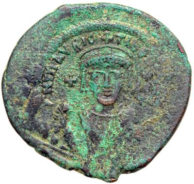 Byzantine Empire. Maurice Tiberius, 582-602. follis or 40 nummi (13.55g), Constantinople, 4th officina, 602 (regnal year. 21). Crowned bust facing, wearing consular robes and holding mappa and eagle-tipped scepter. Large M between ANNO and XXI. DOC 45 var. (this officina not recorded); MIB 68D (only two specimens cited); Sear 495. Nearly Very Fine and a very rare consular issue of the emperor's last year, areas of flatness in the striking.