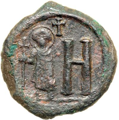 Byzantine Empire. Maurice Tiberius with Constantina and Theodosius. follis or 8 pemtanummia (12.98g), Cherson, 593-596. CERcwNOC, Maurice and the Empress Constantina, both nimbate, stg. facing side by side, the emperor holding gl. cr., the empress cruciform scepter, cross between their hds. Rev. Large H with cross above, to l. of which stands Theodosius facing, nimbate, holding P-headed cross. DOC 299 var.; MIB 158b; Sear 605 var. Good Very Fine and rare.