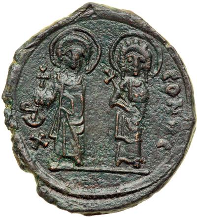 An alternative attribution for these anonymous types is the reign of Justin II (565-578), in which case the empress depicted would be Sophia and the figure on reverse Tiberius II Constantine who was created Caesar in 574. Extremely Fine with jade green patina, an outstanding specimen of this rare issue