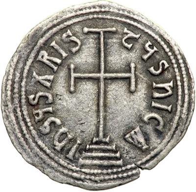 Byzantine Empire. Michael III, Theodora and Thecla, 842-867. Silver Miliaresion, Constantinople. 842-56. IhSUS XRISTUS NICA, cross potent on three steps, triple border. Rev. Inscription of Michael, his mother and his sister in five lines across field, triple border. DOC 5; Sear 1690. Very Fine and scarce.