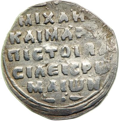 Byzantine Empire. Michael VII and Maria, 1071-1078. Silver Miliaresion (1.46g), Constantinople. Cross crosslet on globus resting on four steps, with X at center and pellet within crescent on shaft, facing crowned busts of Michael, wearing jeweled chlamys, on l., and Maria, wearing loros, on r., [triple border]. Rev. Inscription of Michael and Maria in five lines across field, triple border. DOC 6; Sear 1874. Fine and scarce, edge clipped.