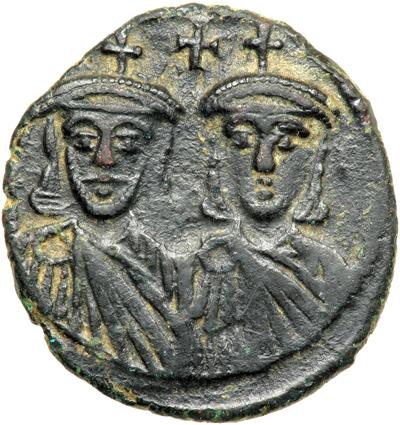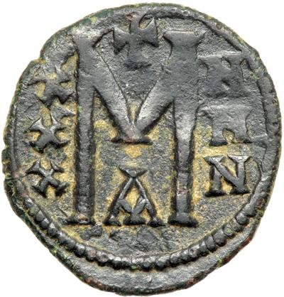 Byzantine Empire. Nicephorus I and Stauracius, 803-811. follis or 40 nummi (4.63g), Constantinople. No legend, Facing crowned busts of Nicephorus I and his son, each wearing chlamys, cross above. Rev. Large M between XXX and NNN, cross above, A beneath. DOC 5; Sear 1607. Very Fine or better with dark patina.