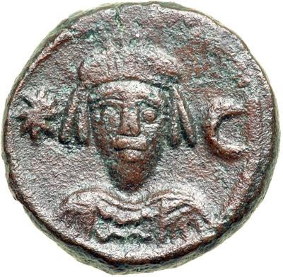 Byzantine Empire. PERSIAN OCCUPATION OF EGYPT, 618-628. dodecanummium or 12 nummi (15.12g), Alexandria. Facing crowned bust of the Sassanid king Khusru II between large star and crescent, the crown surmounted by cross within crescent. Rev. Large I B with cross potent on globus between, ALEZ in ex. DOC 192; MIB 202a; Sear 856. Good Very Fine with brown patina, a handsome example of this rare and interesting issue.