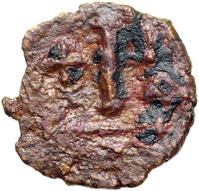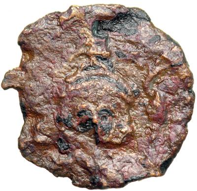 Byzantine Empire. Philippicus, 711-713. decanummium or 10 nummi (1.12g), Constantinople, 1st officina, 711/12 (regnal. year 1). Crowned bust facing, wearing loros and holding gl. cr. and eagle-tipped scepter. Rev. Large I between cross and I / A, [CON] in ex. DOC 13 var. (this officina not recorded); MIB 23; Sear 1457. Nearly Fine/fine and extremely rare, irregular flan.