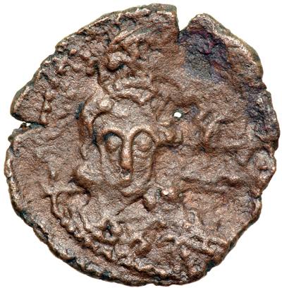 Byzantine Empire. Philippicus, 711-713. half follis or 20 nummi (1.68g), Constantinople, 2nd officina, 711/12 (regnal. year 1). Crowned bust facing, wearing loros and holding gl. cr. and eagle-tipped scepter. Rev. Large K between [ANNO] and I, B beneath. DOC 12; MIB 22; Sear 1456. Nearly Very Fine and very rare, the types partially obscured by overstriking.
