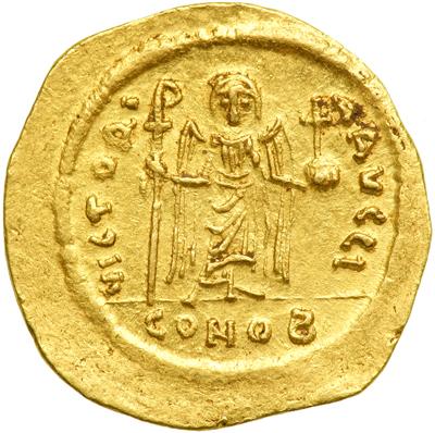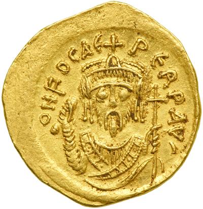 Byzantine Empire. Phocas, 602-610. Consular Gold Solidus (4.5g), Constantinople, 10th officina. 602. D N FOCAE PERP AVG, bust facing, in consular robes, wearing crown with pendilia and holding mappa and cross. Rev. VICTORIA AVGG I, angel facing, holding long P-headed cross and gl. cr., CONOB in ex. DOC 3 (same rev. die); MIB 1; Sear 622. Good Very Fine and very rare, possibly only the seventh known example of this important type.