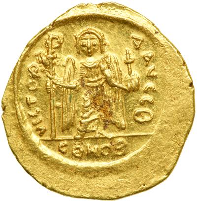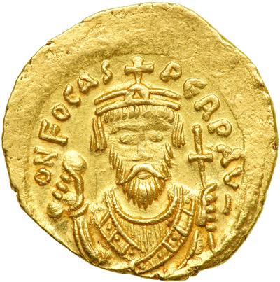 Byzantine Empire. Phocas, 602-610. Consular Gold Solidus (4.48g), Constantinople, 2nd officina. 603. Similar to previous, but with FOCAS for FOCAE and crown without pendilia on obv., and the rev. legend ends AVGG B. DOC 4a (same dies); MIB 2; Sear 623. Nearly Extremely Fine and very rare, the portrait a little weakly struck and some surface deposits on reverse.