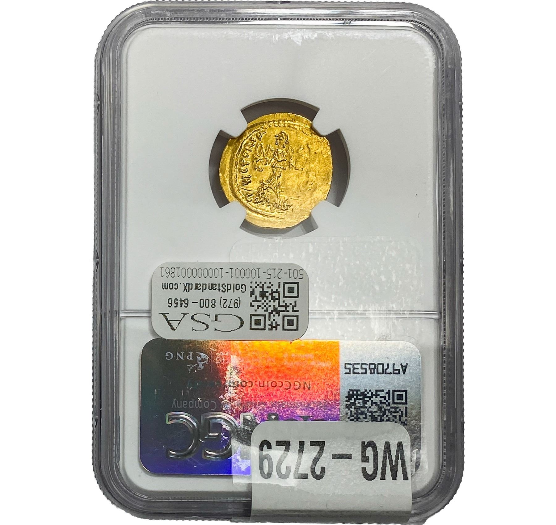 e. Coins sold referencing a third-party grading service are sold “AS IS” without any express or implied warranty, except for a guarantee by GSA that they are genuine. Removal or alteration of the holder, voids all of Bidder’s claims concerning that Product. Certain warranties may be available from the grading services and Bidders are referred to them for further details: Numismatic Guaranty Corporation (NGC), PO Box 4776, Sarasota, FL 34230, www.ngccoin.com/services/writtenguarantee.asp; Professional Coin Grading Services (PCGS), PO Box 9458, Newport Beach, CA 92658, www.pcgs.com/guarantee.html; ANACS, 6555 S. Kenton St., Ste. 303, Englewood, CO 80111; and Independent Coin Grading Co. (ICG), 7901 East Bellview, Ave., Suite 50, Englewood, CO 80111.