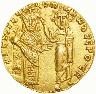 Byzantine Empire. Romanus I, Christopher, and Constantine VII, 921-931. Gold Solidus (4.35g), Constantinople. 921. Romanus, wearing loros and holding gl. cr., stg. facing on l., crowned by Christ stg. facing on r., cross behind head., holding book of Gospels in l. Rev. Facing crowned busts of Christopher, bearded and wearing loros, on l., and Constantine, beardless and wearing chlamys, on r., holding patriarchal cross between them. DOC 5; Sear 1744. Extremely Fine and extremely rare.