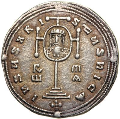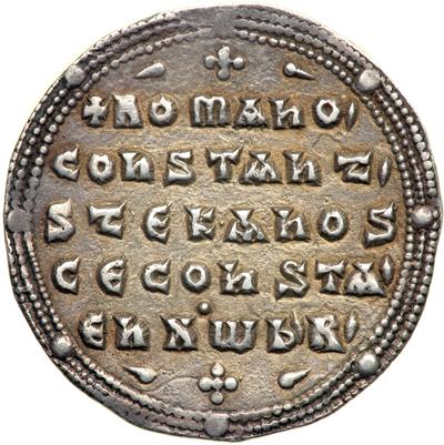 Byzantine Empire. Romanus I and Constantine VII with Stephen and Constantine, 931-944. Silver Miliaresion (2.72g). Constantinople IhSUS XRISTUS NICA, cross potent on three steps, oval medallion with bearded bust of Romanus at center, R/with - M/A in field, triple border with four equally spaced pellets. Rev. Inscription of the four emperors in five lines across field, triple border with eight equally spaced pellets. DOC 20; Sear 1755. Good very fine and toned, scarce and interesting.