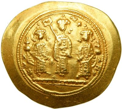 Byzantine Empire. Romanus IV and Eudocia, with Michael VII, Constantius and Andronicus, 1068-1071. Gold Histamenon. Nomisma (4.31g), Constantinople Similar to previous, but on obv. the three emperors stand on a single dais instead of individual footstools. DOC 2; Sear 1861. Extremely Fine.