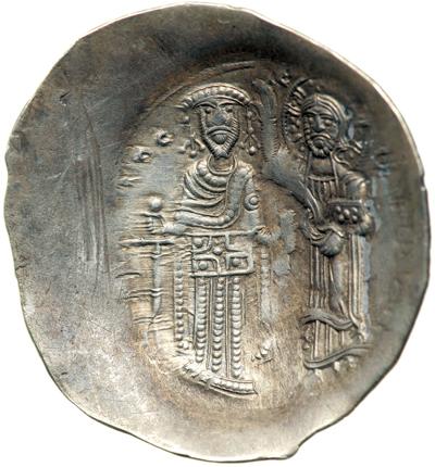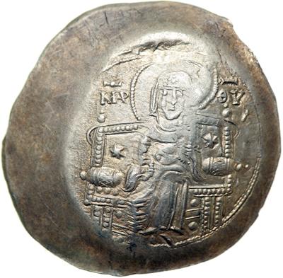 Byzantine Empire. The Empire of Thessalonica, Theodore, Comnenus-Ducas, 1224-1230. Silver Aspron Trachy Nomisma (2.51g). Thessalonica 1225/6. The Virgin seated facing on square-backed throne, holding before her nimbate head. of the infant Christ, stars to l. and to r. above arms of throne. Rev. Facing stg. figures of Theodore, on l., and Christ, with nimbus cr., on r., the emperor wearing divitision, jeweled loros and sagion and holding sheathed sword and akakia, Christ crowning the emperor with r. hand and holding book of Gospels in l. DOC 3 var.; Hendy pl. 37, 5-6; Sear-Bendall 2160. Good Very Fine and very rare.