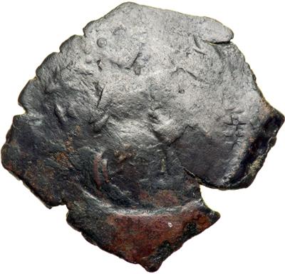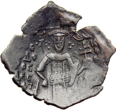 Byzantine Empire. The Empire of Thessalonica, Theodore, Commenus-Ducas, 1224-1230. Billon Aspron Trachy Nomisma (1.6g). Thessalonica1. 229/30. Effaced bust of Christ Emmanuel facing. Rev. Theodore stg. facing, crowned and wearing loros and sagion, holding labarum and globus surmounted by patriarchal cross, manus Dei in upper field to r. Unpublished in the standard works of reference in this size; for the full-sized billon trachy of this type, cf. DOC 10 (type G), Hendy pl. 38, 8-9, and Sear-Bendall 2168. The reverse Very Fine, the obverse effaced in striking, very rare.