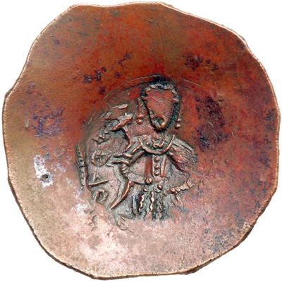 Byzantine Empire. Theodore Mancaphas, usurper in Philadelphia, 1188-1189. billion trachy (4.28g), Philadelphia. Christ stg. facing, his r. hand raised in benediction, holding book of Gospels in l. Rev. Theodore stg. facing, wearing crown and jeweled loros and holding long patriarchal cross with both hands. DOC 2; Grierson 1127. Very Fine for the type and very rare, light brown patina.