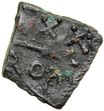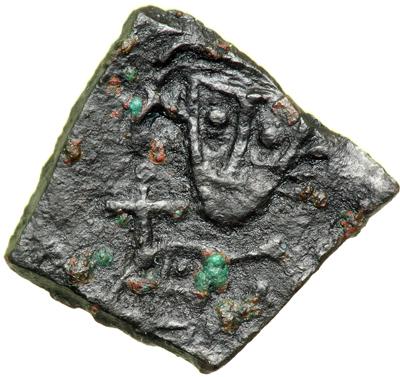 Byzantine Empire. Theodosius III, 715-717. Bronze three-quarter follis or 30 nummi (0.73g). Obv. As previous, but the globus is surmounted by simple cross instead of patriarchal. Rev. Mark of value XXX, ROM in ex. DOC -; MIB 17; Murari p. 336, 13 and pls. II and IV; Sear 1501. Struck on a square flan, Very Fine and very rare.