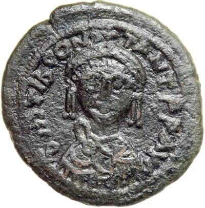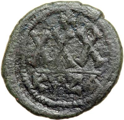 Byzantine Empire. Tiberius II Constantine, 578-582. three-quarter follis or 30 nummi (12.83g), Cyzicus, 1st officina. 578/9. Crowned bust facing. Rev. Large XXX, KYZ A in ex. DOC 37a; MIB 42; Sear 445. Fine and rare with black patina.