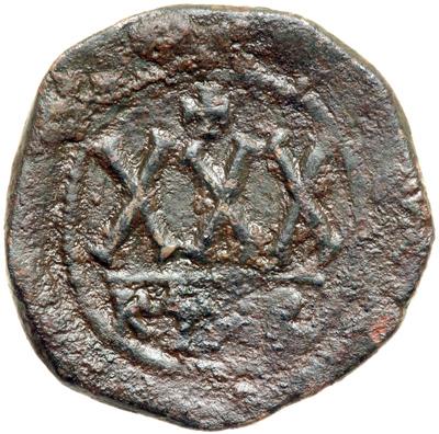 Byzantine Empire. Tiberius II Constantine, 578-582. three-quarter follis or 30 nummi (12.83g), Cyzicus, 2nd officina. 578/9. Crowned bust facing. Rev. Large XXX, KYZ B in ex. DOC 37b; MIB 42; Sear 445. Fine and rare with brown patina.