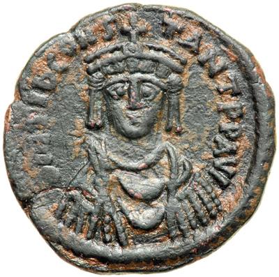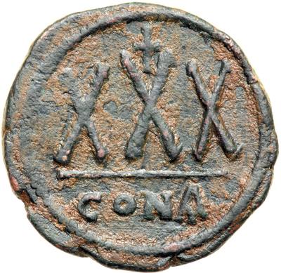 Byzantine Empire. Tiberius II Constantine, 578-582. three-quarter follis or 30 nummi (13.27g), Constantinople, 1st. officina, 578/9. Crowned bust facing. Rev. Large XXX, CON A in ex. DOC 15b; MIB 27; Sear 432. Good very fine/very fine with brown patina.