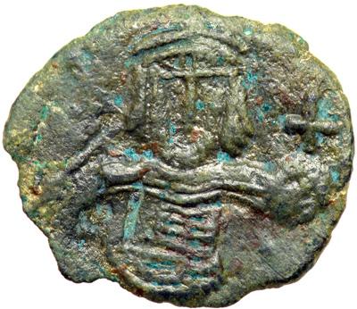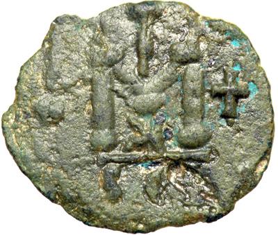 Byzantine Empire. Tiberius III, 698-705. follis or 40 nummi (1.95g), Syracuse, c. 701-5. No legend, Tiberius stg. facing, wearing long tunic and holding long cross and gl. cr. Rev. Large M between two crosses, monogram of Tiberius above, star beneath, SCL in ex. DOC 33; MIB 80; Sear 1396. Good very fine and rare with nice green patina.