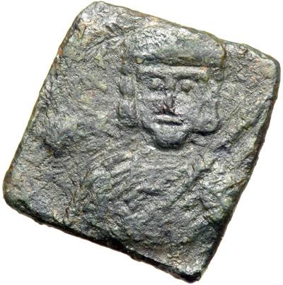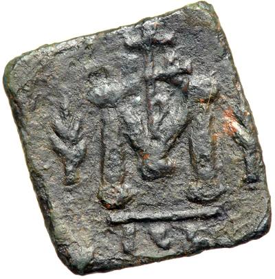 Byzantine Empire. Tiberius III, 698-705. follis or 40 nummi (2.34g), Syracuse, c. 698-701. No legend, crowned bust facing, holding diagonal spear and shield, star to l. Rev. Large M between two palms, monogram of Tiberius above, SCL in ex. DOC 32; MIB 79b; Sear 1395. Nearly Very Fine and rare, struck on a square flan, dark patina.