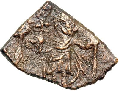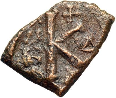 Byzantine Empire. Tiberius III, 698-705. half follis or 20 nummi (3.4g), Constantinople, 1st officina, 701/2 (regnal. year 4). Tiberius, in military attire, stg. facing, holding gl. cr. and long cross. Rev. Large K between ANNO and regnal year delta (= 4). DOC 13; MIB 76; Sear 1369. Very Fine for the issue and very rare, overstruck probably on a quartered follis of Constantine IV.
