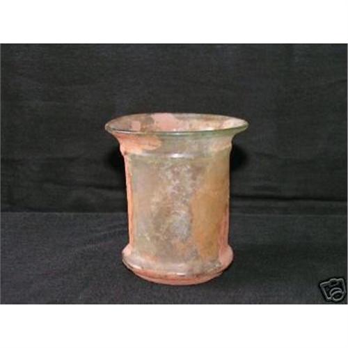 On sale is a rare "Byzantine Green Glass Cup" circa 400A.D. to 600 A.D. Featured is a mold cast, green glass vessel used for libations or medicines. It has a flared lip with drop rim design and a solid rimmed base. The cup has earthen encrustation and a lovely iridescence! The glass is in exquisite condition.
