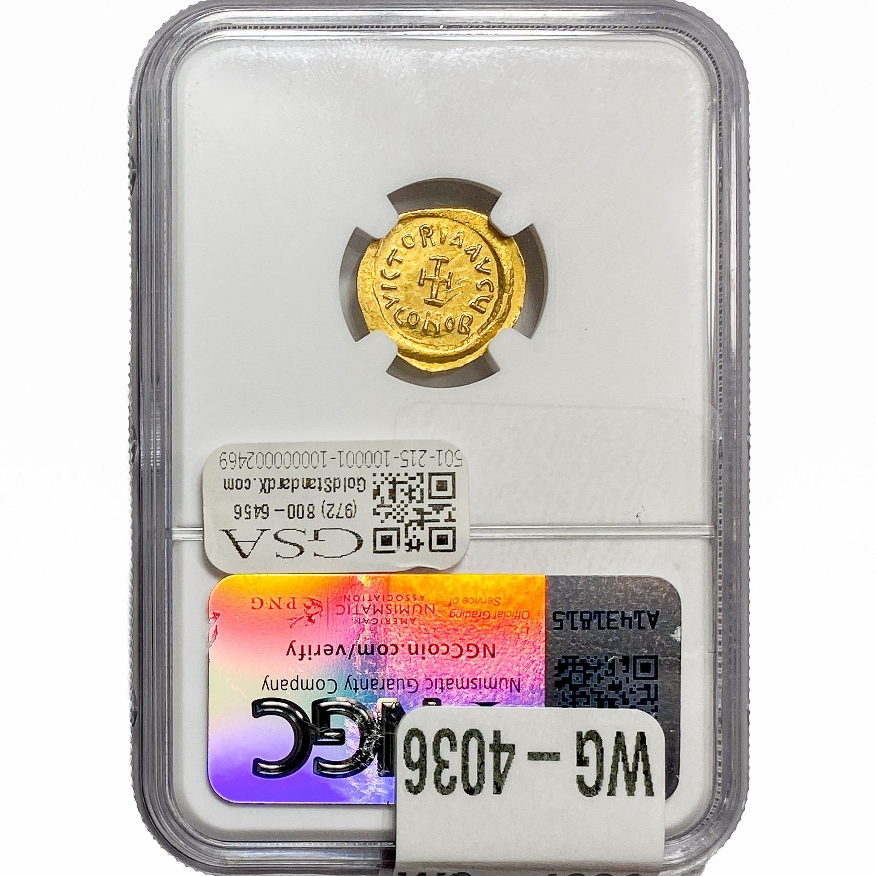 e. Coins sold referencing a third-party grading service are sold “AS IS” without any express or implied warranty, except for a guarantee by GSA that they are genuine. Removal or alteration of the holder, voids all of Bidder’s claims concerning that Product. Certain warranties may be available from the grading services and Bidders are referred to them for further details: Numismatic Guaranty Corporation (NGC), PO Box 4776, Sarasota, FL 34230, www.ngccoin.com/services/writtenguarantee.asp; Professional Coin Grading Services (PCGS), PO Box 9458, Newport Beach, CA 92658, www.pcgs.com/guarantee.html; ANACS, 6555 S. Kenton St., Ste. 303, Englewood, CO 80111; and Independent Coin Grading Co. (ICG), 7901 East Bellview, Ave., Suite 50, Englewood, CO 80111.