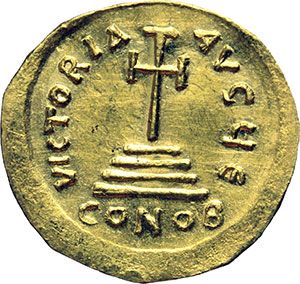 Byzantine. Heraclius (610-641). Solidus, Constantinople. Obv.: dN hERACLIYS PP AVC. Helmeted, draped and cuirassed bust facing, wearing short beard, holding cross. Rev.: VICTORIA AVGYE. Cross potent set on three steps. D.O. 3. Ratto 1278. AU. g. 4.40 mm. 20.00 EF. Impero Bizantino. Eraclio (610-641). Solido, Costantinopoli. D/ dN hERACLIYS PP AVC. Busto drappeggiato e corazzato di fronte, con corta barba che indossa elmo piumato e tiene una croce. R/ VICTORIA AVGYE. Croce potenziata su tre gradini. Sotto, CONOB. D.O. 3. Ratto 1278. AU. g. 4.40 mm. 20.00 SPL.