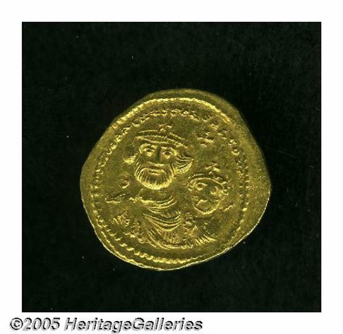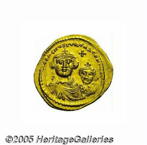 <B>Heraclius.</B></I> A.D. 610-641. AV solidus (22 mm, 4.40 g). Constantinople, ca. A.D. 616-625. Crowned facing busts of Heraclius and Heraclius Constantine; cross between / Cross potent on three steps; E/CONOB. DOC 13d; SB 738. Good VF. An interesting f