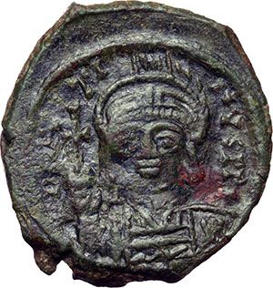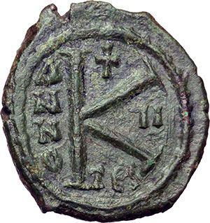 Byzantine. Justin II (565-578). Half follis, Thessalonica. Obv.: DN IVSTINVS P P []. Elmeted and cuirassed bust facing, holding globus cruciger and shield. Rev.: Great K. Cross above. A/N/N/O II (year) across field. TES below. Sear 365. AE. g. 6.35 mm. 23.00 VF+/About EF. Impero Bizantino. Giustino II (565-578). Mezzo follis, Tessalonica. D/ DN IVSTINVS P P []. Busto elmato e corazzato di fronte, che tiene globo crucigero e scudo. R/ Grande K. Sopra, croce. A sinistra A/N/N/O. A destra, II. Sotto, TES. Sear 365. AE. g. 6.35 mm. 23.00 BB+/qSPL.