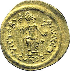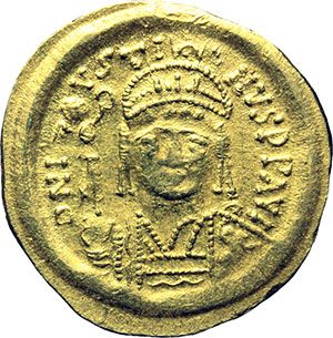 Byzantine. Justin II (565-578). Solidus, Constantinople. Obv.: D N IVSTINVS PP AVI. Elmeted and cuirassed beardless bust facing, holding Victory on globe and shield. Rev.: VICTORIA AVGGG T. Constantinople seated facing, head right, holding shield and globus cruciger. CONOB in exergue. D.O. 4. Sear 345. AU. g. 4.46 mm. 20.00 VF/EF. Impero Bizantino. Giustino II (565-578). Solido, Costantinopoli. D/ D N IVSTINVS PP AVI. Busto imberbe elmato e corazzato di fronte, che tiene Vittoria su globo e scudo. R/ VICTORIA AVGGG T. Costantinopoli, seduta di fronte con il capo a destra, tiene lancia e globo crucigero. In esergo: CONOB. D.O. 4. Sear 345. AU. g. 4.46 mm. 20.00 BB/SPL.