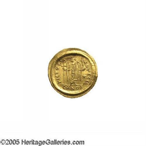 <B>Justinian I.</B></I> A.D. 527-565. AV solidus (22 mm, 4.50 g). Constantinople, A.D. 545-565. Diademed, helmeted and cuirassed bust facing, holding globus cruciger and shield decorated with a horseman spearing fallen enemy / Angel standing facing, holding long staff surmounted by a Christogram and globus cruciger; star in right field; E/CONOB. DOC 9e; SB 140. Good VF, die rust, obverse scrape.