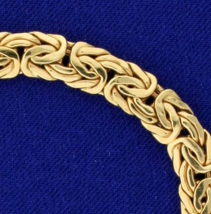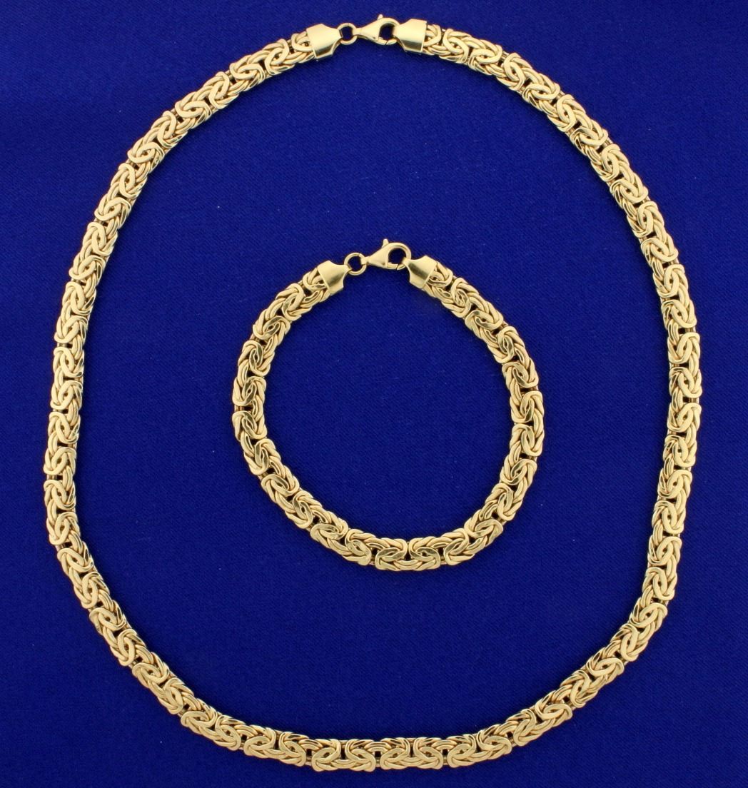 In 14k yellow gold. 18 1/2" necklace and 7 1/2" bracelet. Both 7mm wide and with lobster clasp. 27.3g.