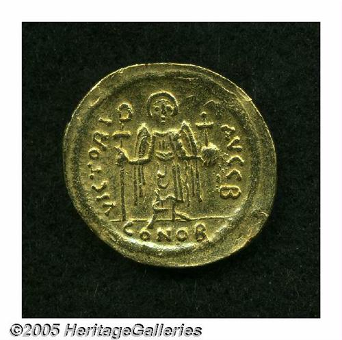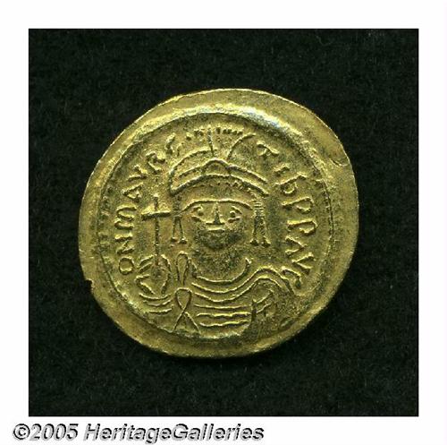 <B>Maurice Tiberius.</B></I> A.D. 582-602. AV solidus (21 mm, 4.51 g). Constantinople, A.D. 583-601. Diademed, cuirassed bust facing, wearing plumed helmet, holding globus cruciger and shield / Angel standing facing, holding long staff surmounted by a Chr