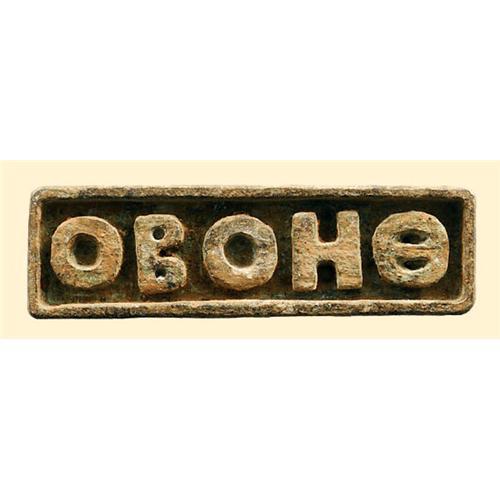Byzantine rectangular bronze seal with a single line Greek inscription. Ca. 6th century AD. L. 3 3/4" (9.6 cm.). The inscription seems to be an abbreviation of "GOD HELP." Excellently preserved with the original ring on back, some earthen encrustation.