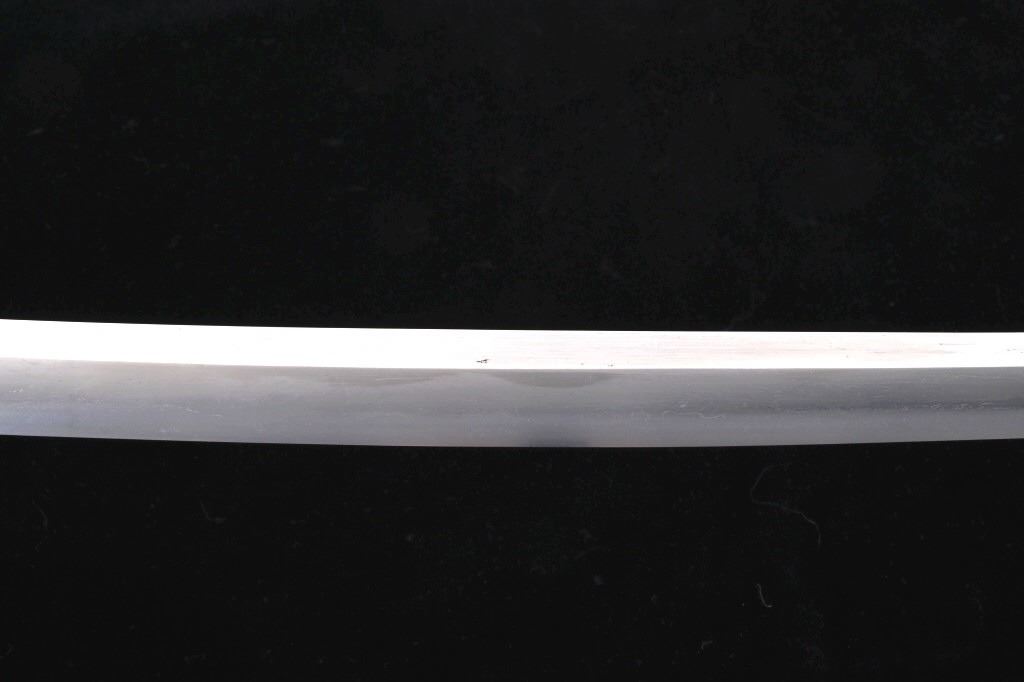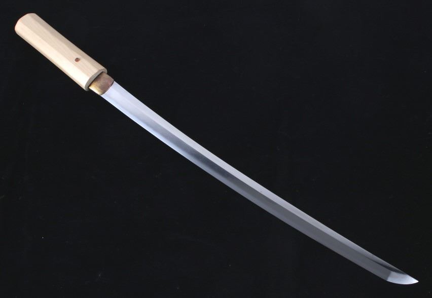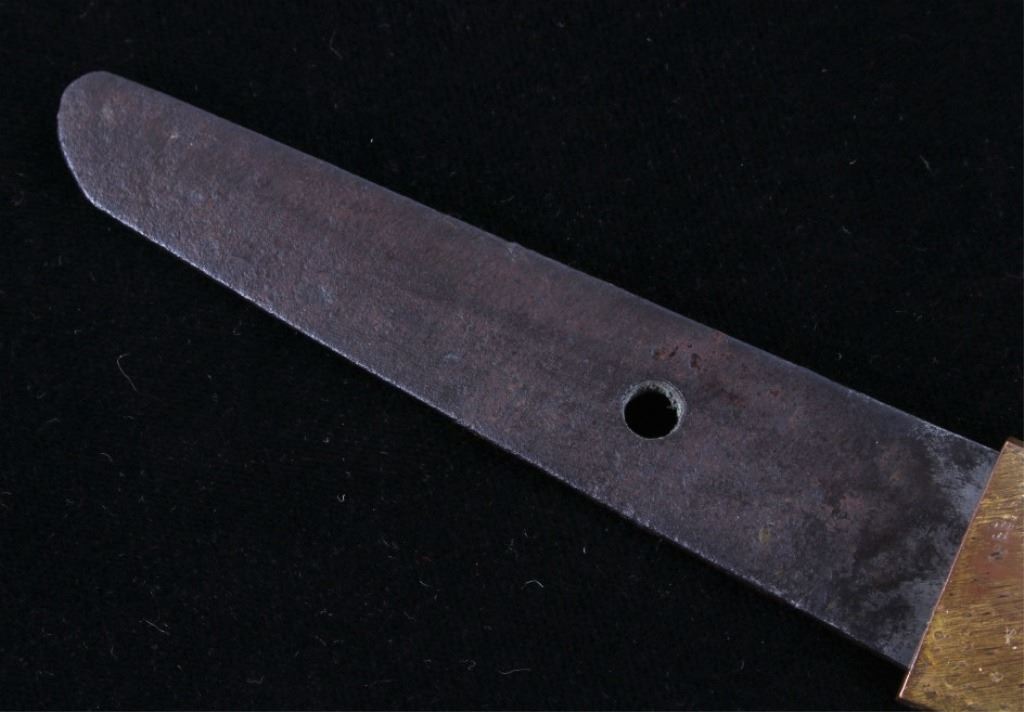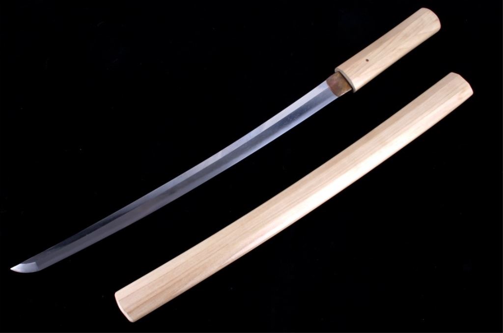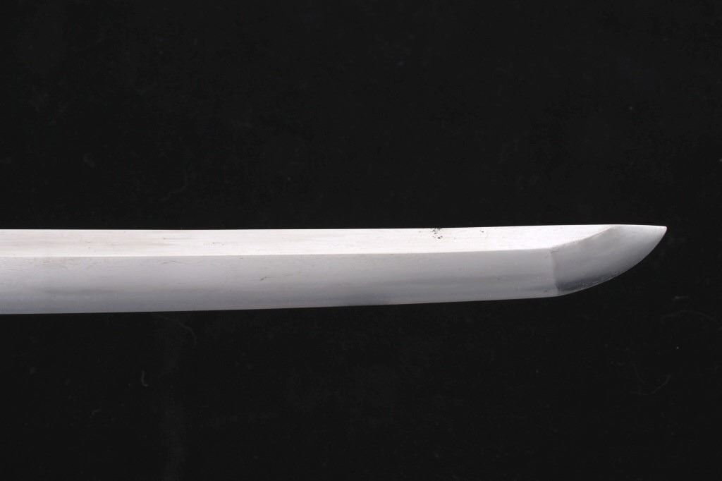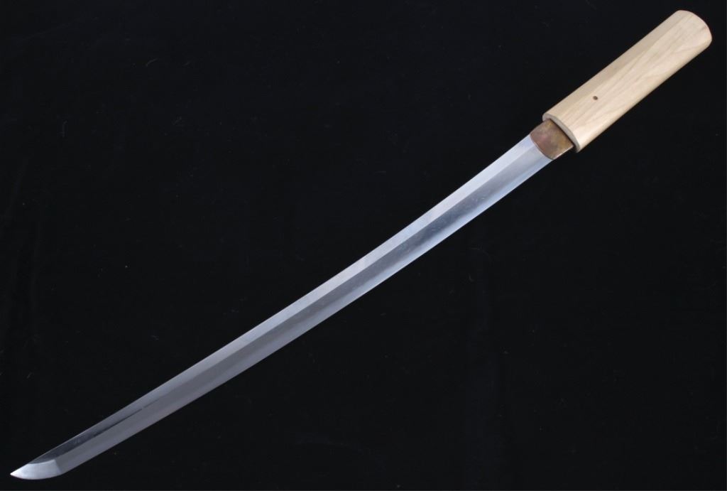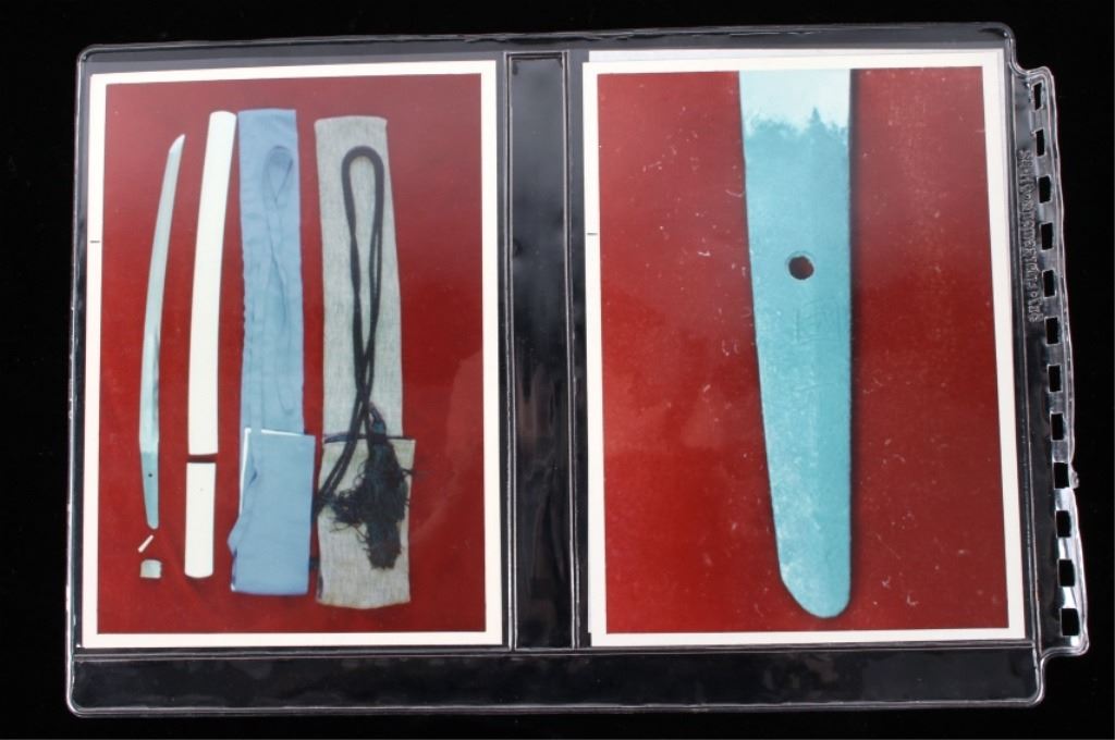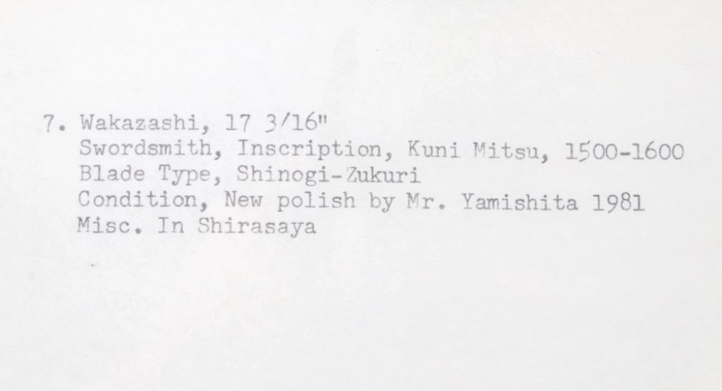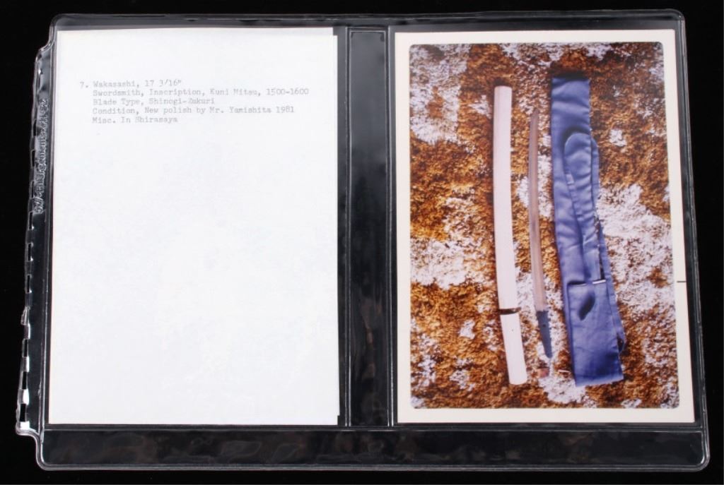 This is an original late Koto early Shinto period circa 1500-1600 Japanese “Samurai” Wakizashi (short sword) signed Kunimitsu with documents and paperwork. This was found to be authentic and correct and offered by Bonhams & Butterfield in a 2004 auction where it was listed in lot 4052 with a value of $4,000-$6,000. The blade exhibits classic very high quality Japanese Damascus like construction in a Wakizashi or short sword pattern with Shinogi Zukuri design with a toriizori curve to the blade. The tang features a swordsmith inscription signature reading Kunimitsu with the blade crafted in the late Koto period (pre-1596) to early Shinto period (1597-1780) circa 1500-1600. The blade displays Damascus construction with a New Japanese polish done in 1981 by Mr. Yamishita. The blade is set in a Shirasaya, a traditional way of storing, transporting, or displaying blades. The all wood construction and seamless design is commonly used to display blades, with the Shirasaya lacking the tsuba for protection or any of the other traditional sword funishings. This blade was featured and sold by Bonhams & Butterfields fine art Auctioneers in 2004 under the lot 4052. The blade comes with copies of the Bonhams & Butterfields catalog along with copies of its original paperwork. The blade also comes with a set of photos from their acquisition in 1980 along with a slip of paper showing the blades details. The wakizashi comes with a proper sword sleeve and shows wonderful condition overall. The blade measures 22" long overall including the tang with the edge measuring 17 3/16". The shirasaya measures 25" long overall. The blade and accoutrements weigh 1lb 10oz.