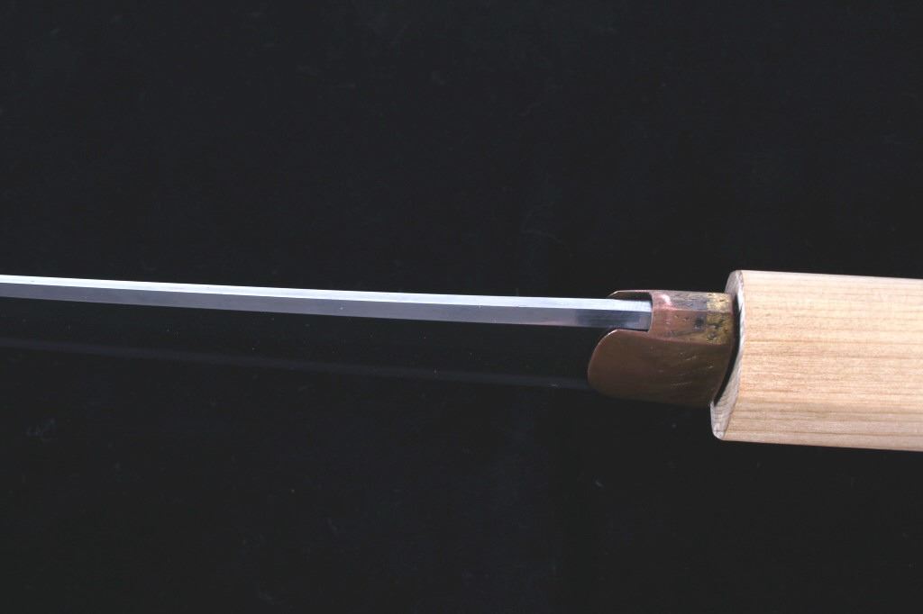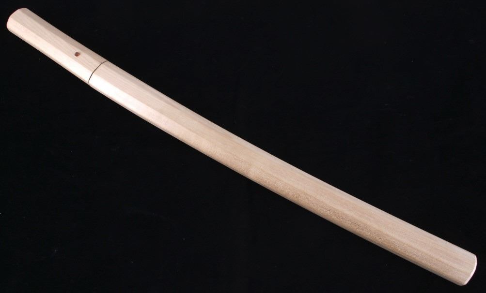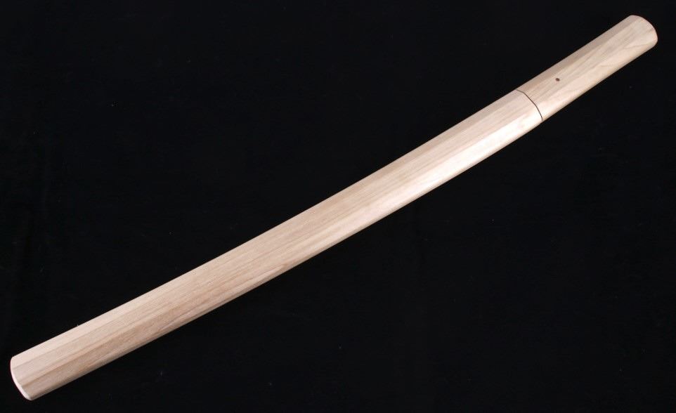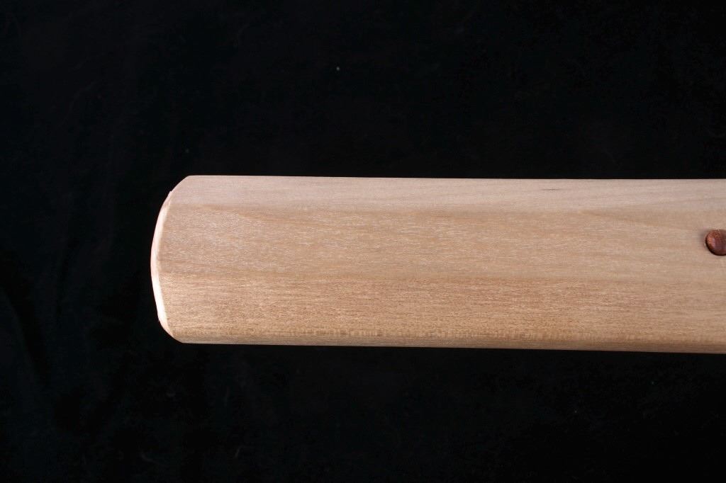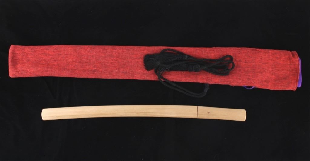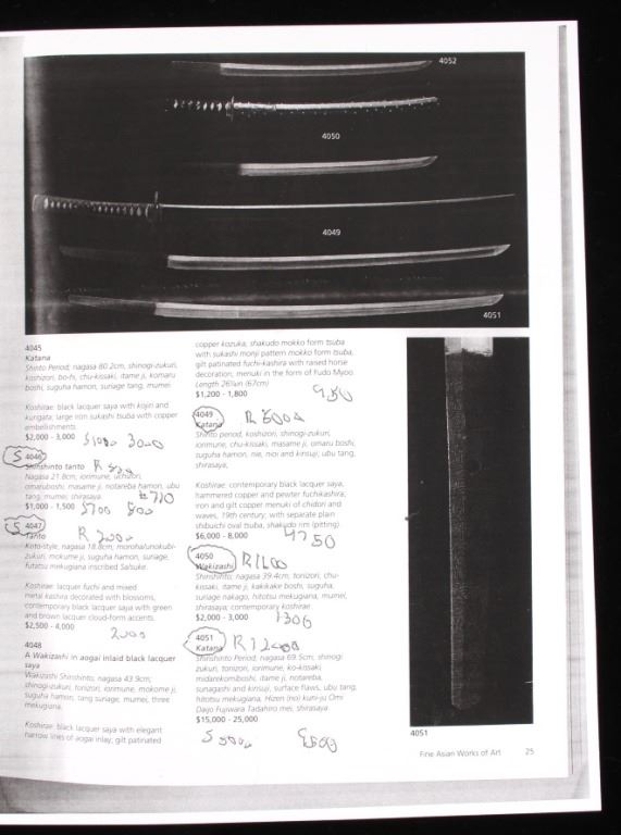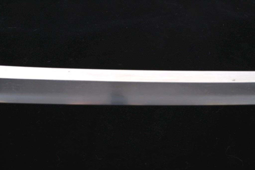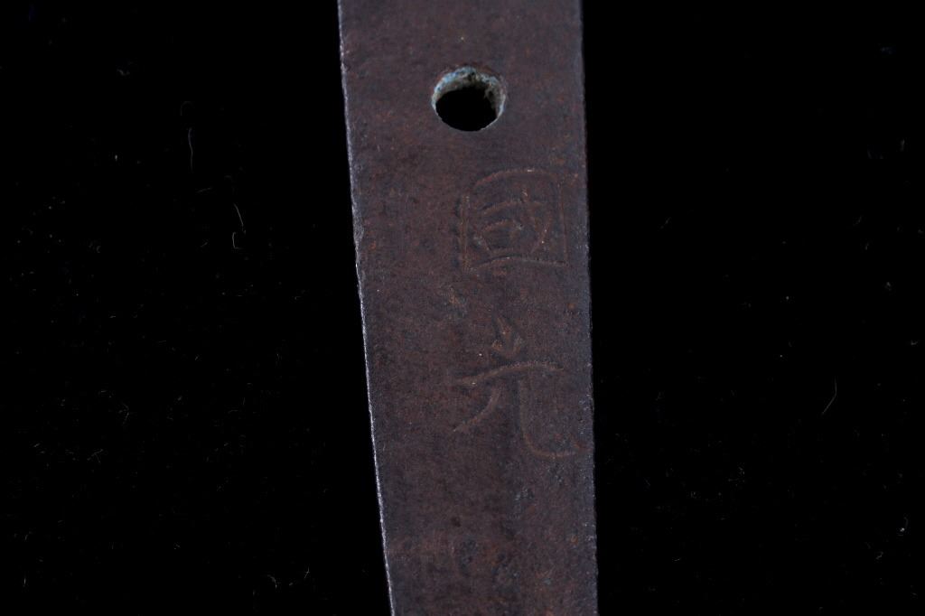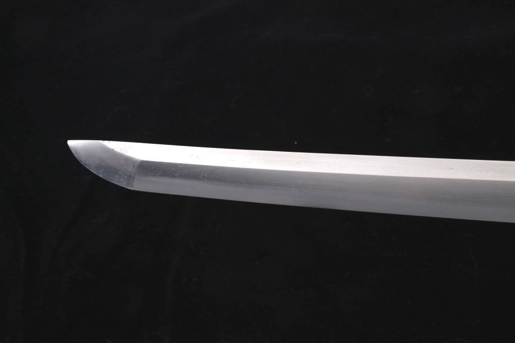 This is an original late Koto early Shinto period circa 1500-1600 Japanese “Samurai” Wakizashi (short sword) signed Kunimitsu with documents and paperwork. This was found to be authentic and correct and offered by Bonhams & Butterfield in a 2004 auction where it was listed in lot 4052 with a value of $4,000-$6,000. The blade exhibits classic very high quality Japanese Damascus like construction in a Wakizashi or short sword pattern with Shinogi Zukuri design with a toriizori curve to the blade. The tang features a swordsmith inscription signature reading Kunimitsu with the blade crafted in the late Koto period (pre-1596) to early Shinto period (1597-1780) circa 1500-1600. The blade displays Damascus construction with a New Japanese polish done in 1981 by Mr. Yamishita. The blade is set in a Shirasaya, a traditional way of storing, transporting, or displaying blades. The all wood construction and seamless design is commonly used to display blades, with the Shirasaya lacking the tsuba for protection or any of the other traditional sword funishings. This blade was featured and sold by Bonhams & Butterfields fine art Auctioneers in 2004 under the lot 4052. The blade comes with copies of the Bonhams & Butterfields catalog along with copies of its original paperwork. The blade also comes with a set of photos from their acquisition in 1980 along with a slip of paper showing the blades details. The wakizashi comes with a proper sword sleeve and shows wonderful condition overall. The blade measures 22" long overall including the tang with the edge measuring 17 3/16". The shirasaya measures 25" long overall. The blade and accoutrements weigh 1lb 10oz.