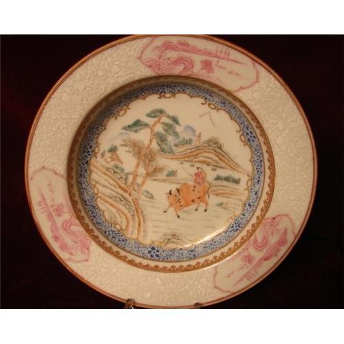 Additional Images available upon request. Two Pairs of these Matching Chinese Export Rare Soup Plates made for the European Market. Perfect Condition. NO RESTORATION!! Price per Pair is Net!! Circa 1723-1735 Pair of Extremely Rare Chinese Export Shallow Soup Bowls measuring 9 3/4" in diameter and 1 3/4" in depth. This well known and documented pattern is "BOY ON A BUFFALO" within a blue enameled border, the rim with pink landscaped borders reserved on a floral scroll in "bianco sopra bianco" enamel. These plates sre in ASA PERFECT CONDITION with NO RESTORATION--GUARANTEED 100%--That you will ever find in Chinese Export Porcelain that dates almost 300 years old. Undoubtely made for the European Market.