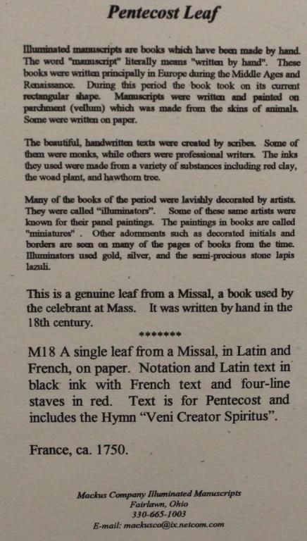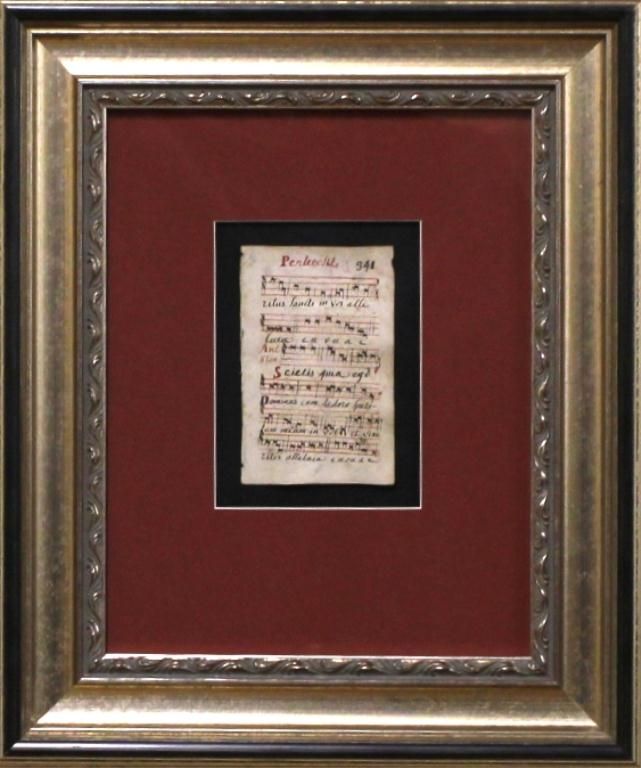 C. 1750 music leaf from a French Missal, on vellum, nicely matted and framed, 16 1/2" X 19 1/2. Est. 150-250