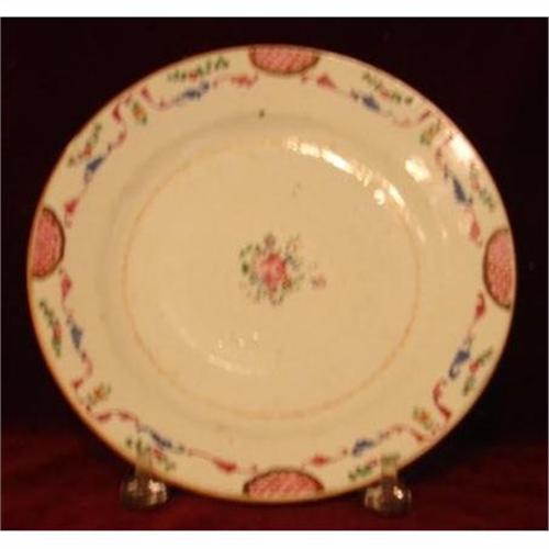Circa 1770 Chinese Export Famille Rose Plate measuring 8 3/4" in diameter and height. This 18TH Century plate has a lot of wear and a few minor nicks on ther edges. A Excellent plate for display in a cabinet.