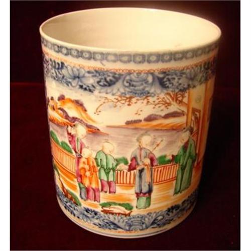 Circa 1770 Chinese Export Very Large and Unusual Huge Size Mandarin Palette Mug/Tankard measuring 5 1/2" in height and 4 7/8" in diameter across the top opening. It has a nice dragon shaped handle which is blue. The tankard is decorated in the rose mandarin colourway with a very fine painted center panel which includes 5 people with a castle, mountains and water in the background.