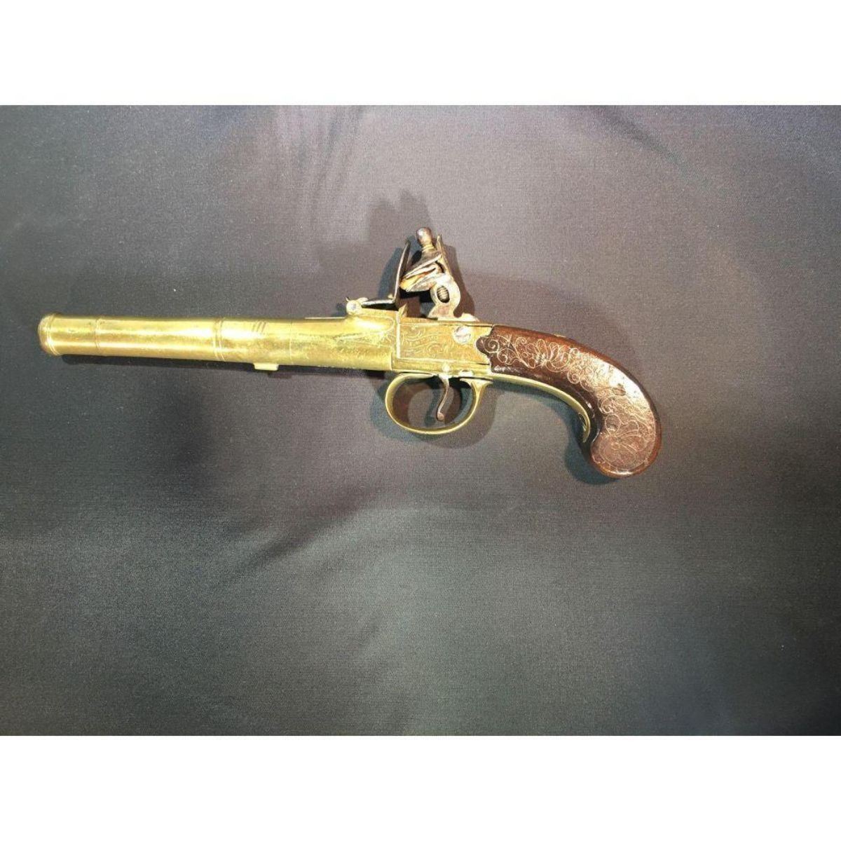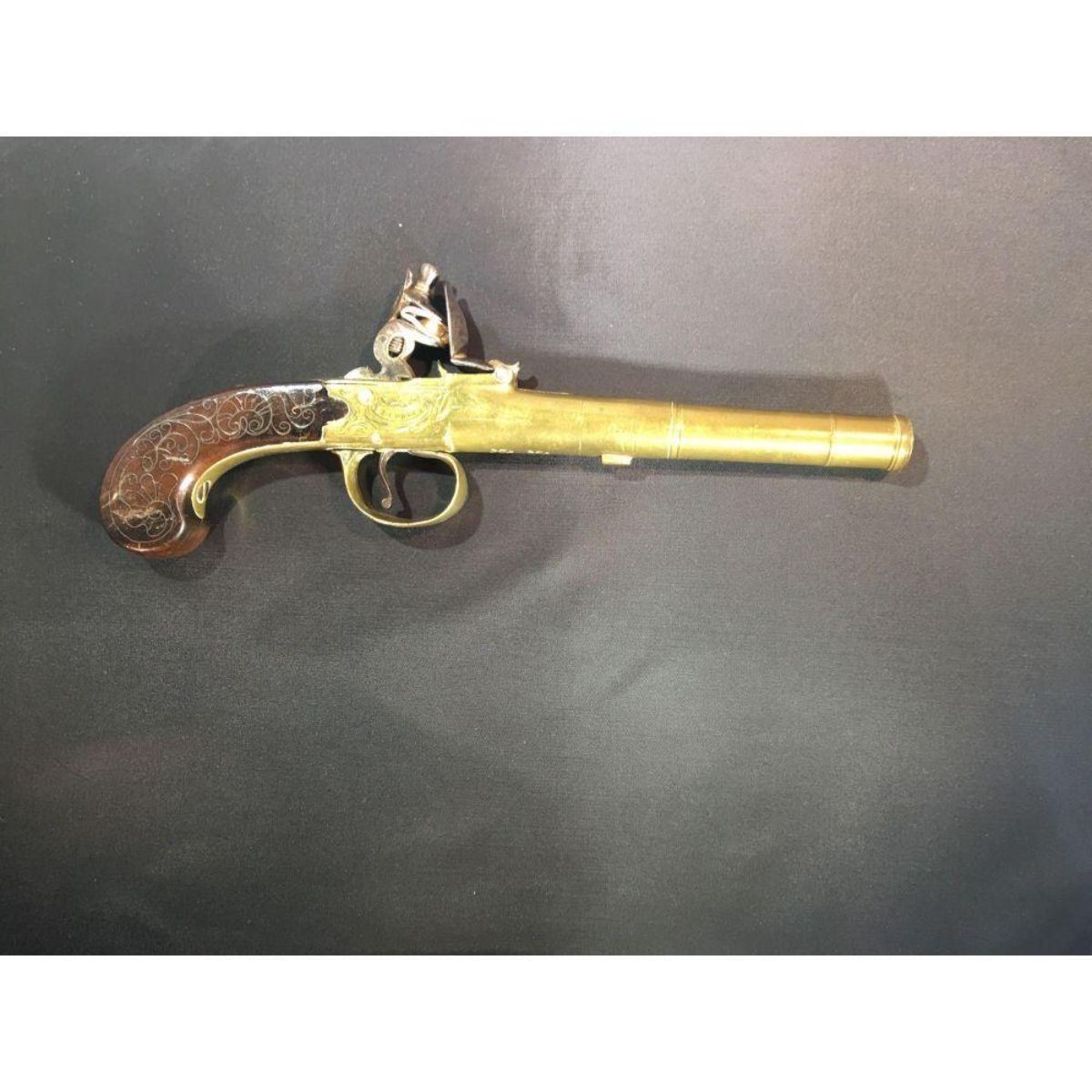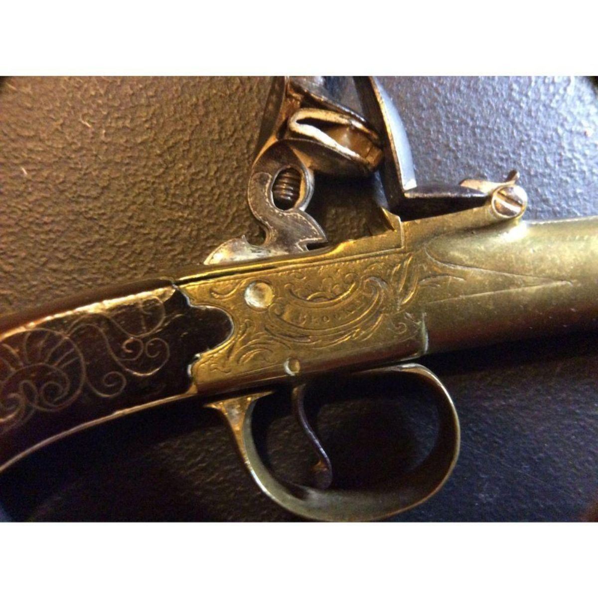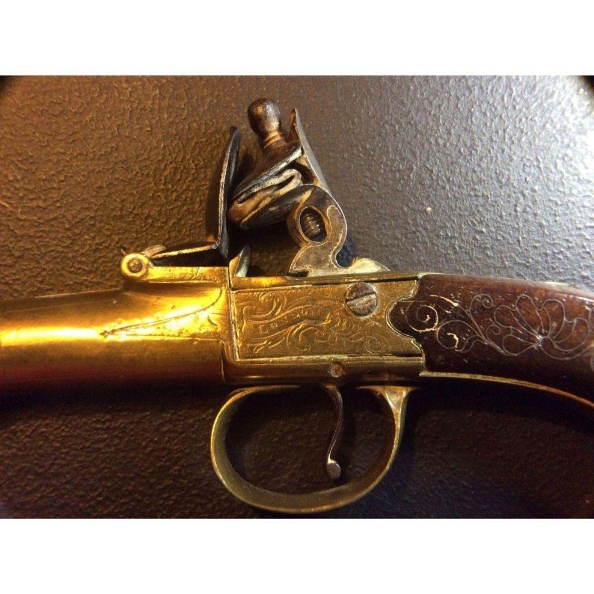 Good Pair of Brass Framed and Cannon Barrelled Flintlock Boxlock Queen Anne Style Traveling Pistols from around 1770, frames border engraved with LOTT CANTERBURY upon foliate banners with flags, sliding trigger guard safety catches, turn off 50-bore cannon barrels, London proof marks with the foreigner’s mark, frizzen springs sunk in breeches, walnut grips inlaid with fine silver wire scrolls and rococo ornament. Barrels 6.5cms, overall 21cms. Needs proper cleaning to restore luster and quality.Â