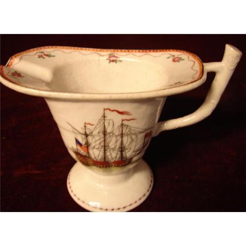 Circa 1780 Chinese Export Nautical Clipper Ship Helmut Pitcher made for the American Market with the Flag of the United States Flying. Nautical 18TH Century Chinese Export Porcelain is very rare and the hottest collectible item in Chinese Export Porcelain. This and another piece of nautical motif was just recently purchased out of a Philadelphia Estate on the Main Line and these are the only pieces with the american flag that we have ever owned. Occasionally we have had nautical items with the british flag. The helmut pitcher is in Very Good Condition with No Restoration. It measures 4 1/2" in height to the top of the spout and 5" to the top of the handle. Measurements from handle to spout is 6 1/2". Additional images are available upon request.
