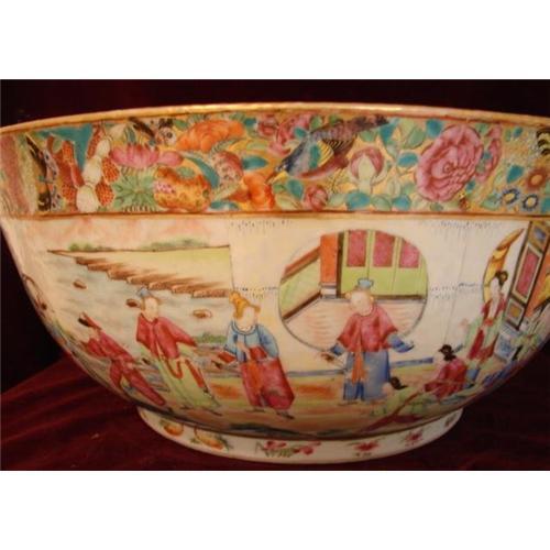 Circa 1800-1820 Early Chinese Export Rose Mandarin Punch Bowl of the Finest Quality that you will find anywhere. This Perfect Bowl measures 15 1/2" in diameter and is 6 1/2" in height and depth. It has a Single Motiff going completely around the bowl on the outside. Continuous scenes of figures with a courtyard scene on the inside of the bowl separated by the greek key border and four quadrants depicting the royal entourage of the emporor in his chariot being pulled by many of the people. One of the quadrants depicts or portrays a man chopping a pig's head. With a central medallion and mythical scenes on the outside, all in Vibrant colors with a high degree of detail. Beautiful gilt highlights and a continuous border with butterflies and roses. Very much gold in and outside and through out this Fabulous bowl that gets a rating of a ten(10). Great detail throughout with great quality and fabulous detail in telling a story of Early Times. Excellent Condition with No Restoration. Additional images are available upon request.