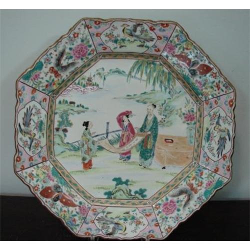 Circa 1800 Chinese Export Famille Rose Octagonal 8-Sided 18" Charger with a small scalloped border, Beautiful Mandarin Landscape in Excellent Condition and Guaranteed not to have any Restoration. The enamels are ver good as is the finely executed art work--bordering on Excellent grade in both the artwork and the finely executed enameling. I am dating this piece as a Early 19th Century piece BUT I would not doubt that it is a Mid-18TH Century piece of porcelain. The last image is apparently the signature of the artist that I have not been able to identify. Additional images are available upon request.