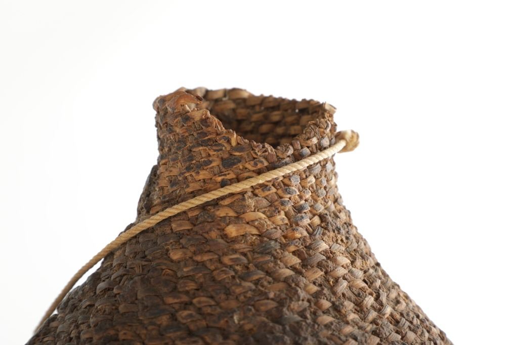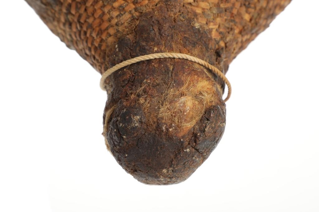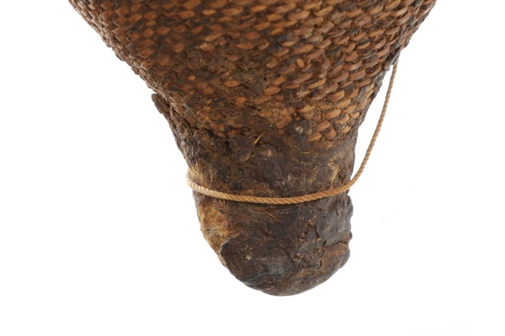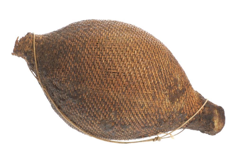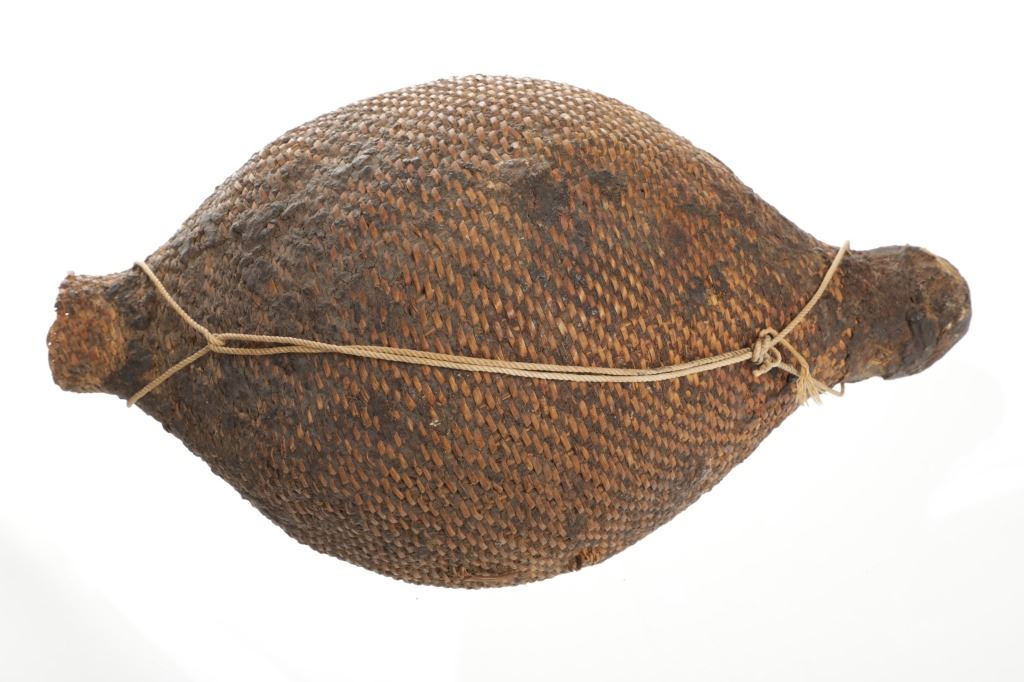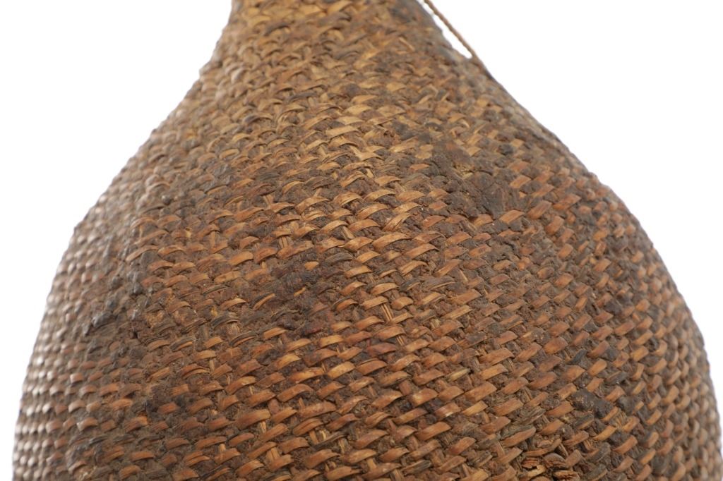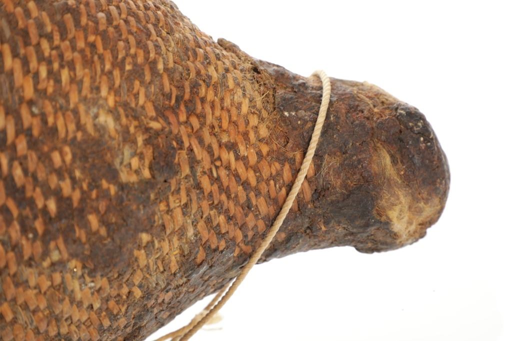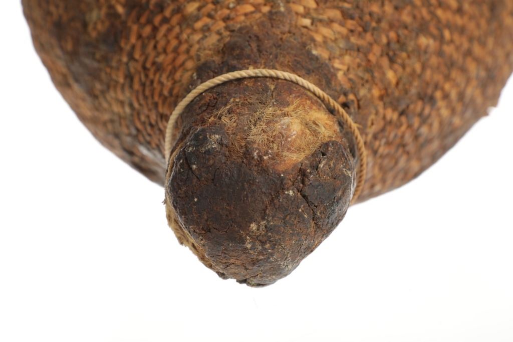 The piece features a circa late 1800’s Jicarilla Apache woven water vessel or jug of coil woven basket. The Apache water jug is commonly referred to as a “Tus”. The piece is hand coil woven basket, which is covered with a brownish red substance, likely a pin pitch / sap that seals the basket making it able to hold water. Provenance: The basket was collected in the 1960’s by Virgil and Barbara Magerfleisch and is being offered from the family directly. The shape, showing a small mouth with wide elongated egg like shape tapering at the end to a cylindrical knob end that mirrors the jar opening, a truly unique and early pattern of Tus not commonly seen (for example of this shape see the early Southwest Apache example collected in 1942 and donated by Joslyn Art Museum Omaha Douglas in the Nebraska State Historical Society, 1800’s White Mesa Ute piece in the Natural History Museum of Utah, and in the MB Abram gallery collection. The sides show remnants of a wrap or handles which have since been lost, the body itself and pitch are well preserved with no major damage visible and most if not all the weaving still intact and in its original tight form, the jar opening shows slight loss the rim, a feature likely occurring during its original use. Truly a fine example, and likely the best available example on the public market. Provenance: From the collection of __ where it was collected in the 1960’s. Measures overall 16.5”L by 9.25”W at the center.
