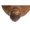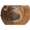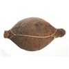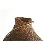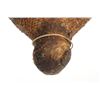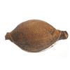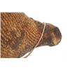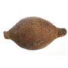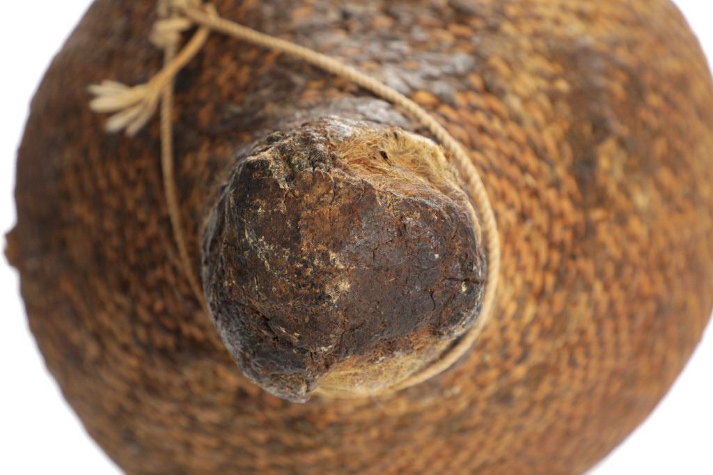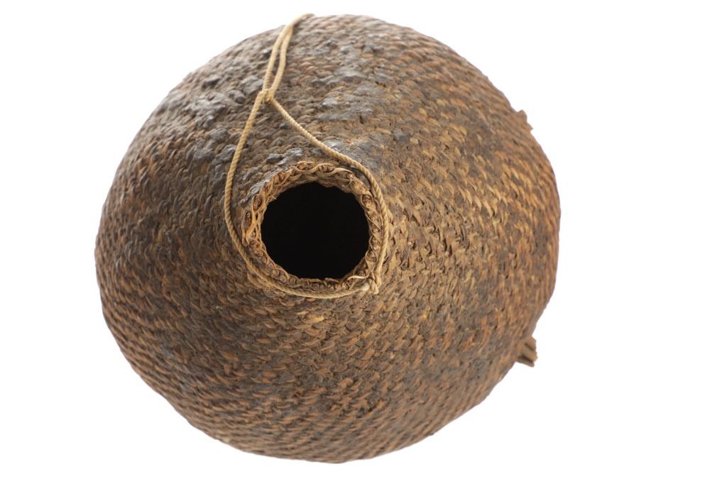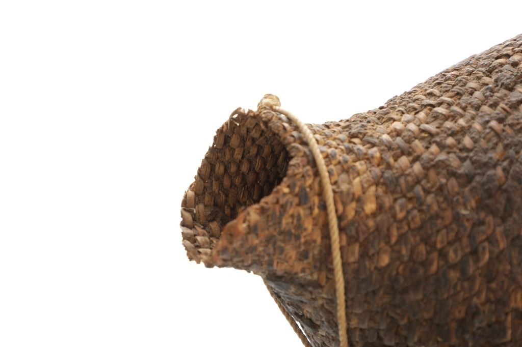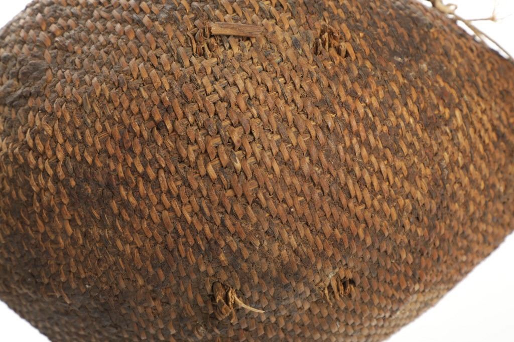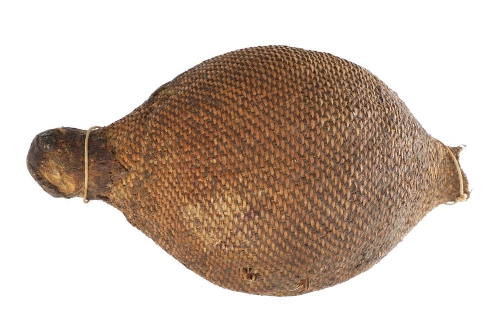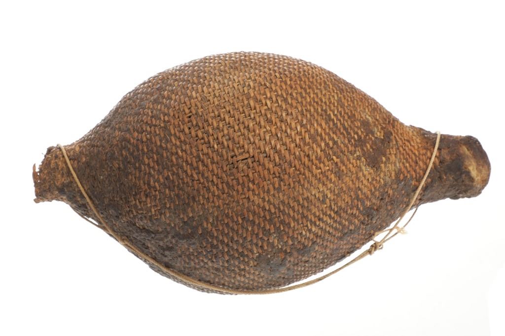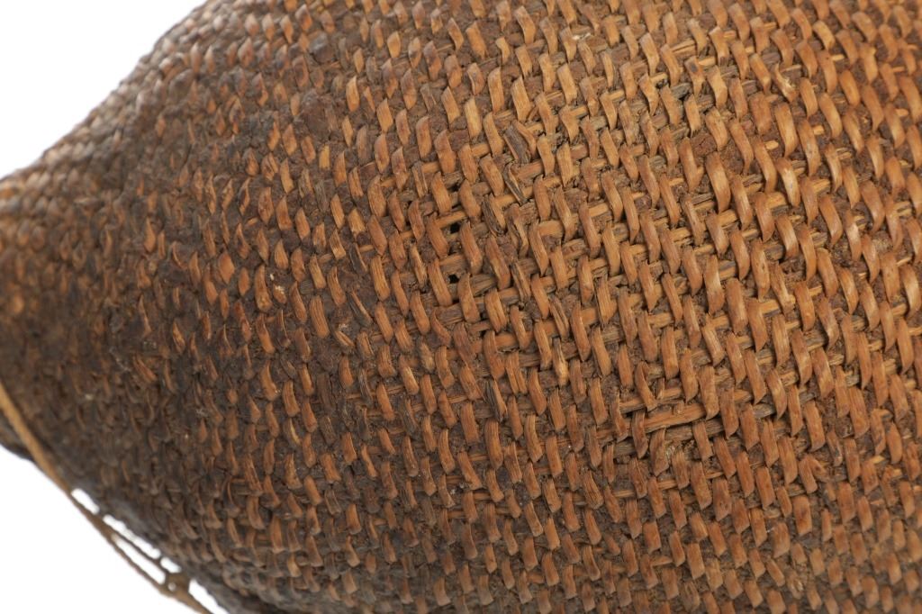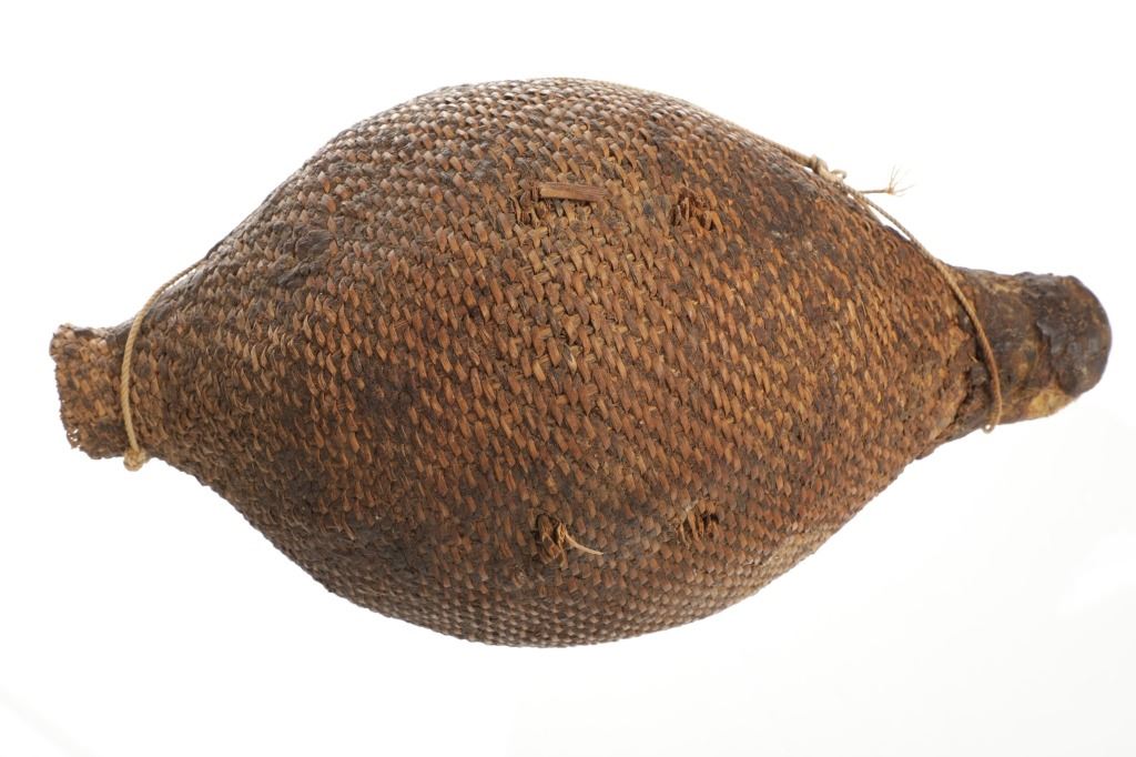 The piece features a circa late 1800’s Jicarilla Apache woven water vessel or jug of coil woven basket. The Apache water jug is commonly referred to as a “Tus”. The piece is hand coil woven basket, which is covered with a brownish red substance, likely a pin pitch / sap that seals the basket making it able to hold water. Provenance: The basket was collected in the 1960’s by Virgil and Barbara Magerfleisch and is being offered from the family directly. The shape, showing a small mouth with wide elongated egg like shape tapering at the end to a cylindrical knob end that mirrors the jar opening, a truly unique and early pattern of Tus not commonly seen (for example of this shape see the early Southwest Apache example collected in 1942 and donated by Joslyn Art Museum Omaha Douglas in the Nebraska State Historical Society, 1800’s White Mesa Ute piece in the Natural History Museum of Utah, and in the MB Abram gallery collection. The sides show remnants of a wrap or handles which have since been lost, the body itself and pitch are well preserved with no major damage visible and most if not all the weaving still intact and in its original tight form, the jar opening shows slight loss the rim, a feature likely occurring during its original use. Truly a fine example, and likely the best available example on the public market. Provenance: From the collection of __ where it was collected in the 1960’s. Measures overall 16.5”L by 9.25”W at the center.