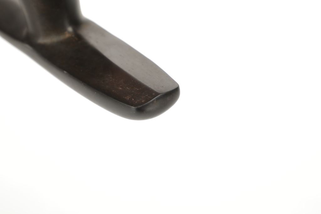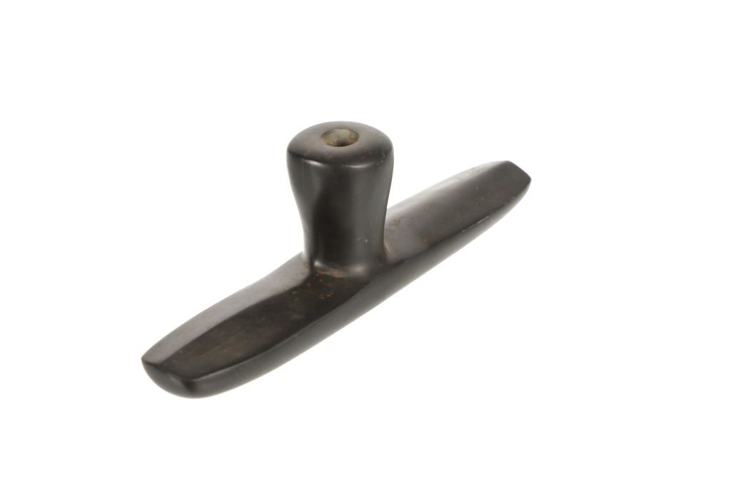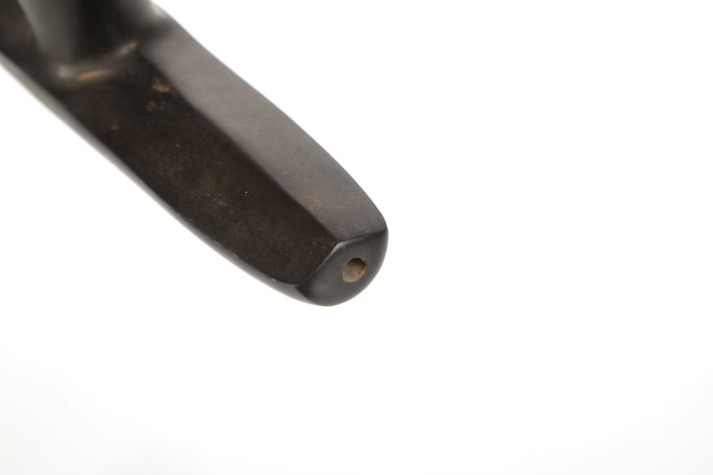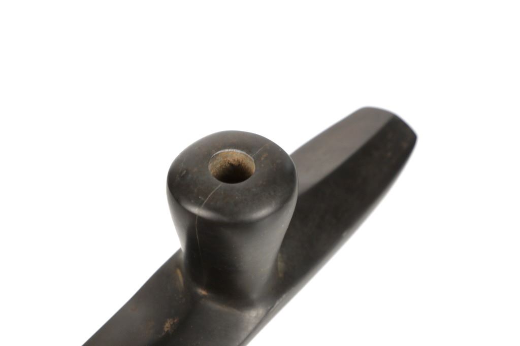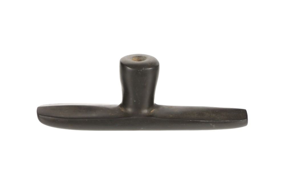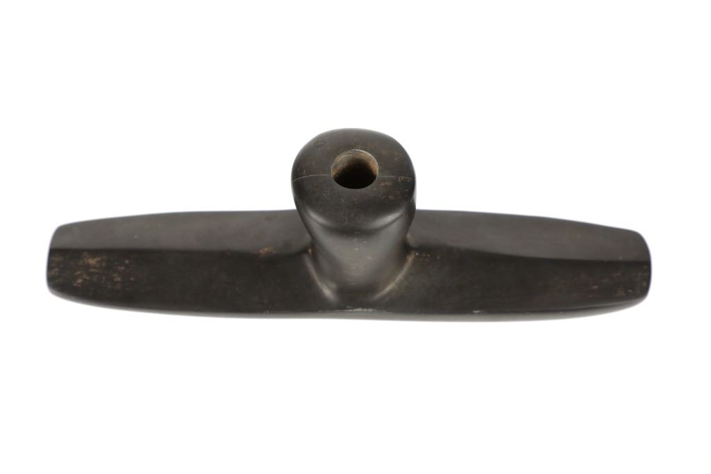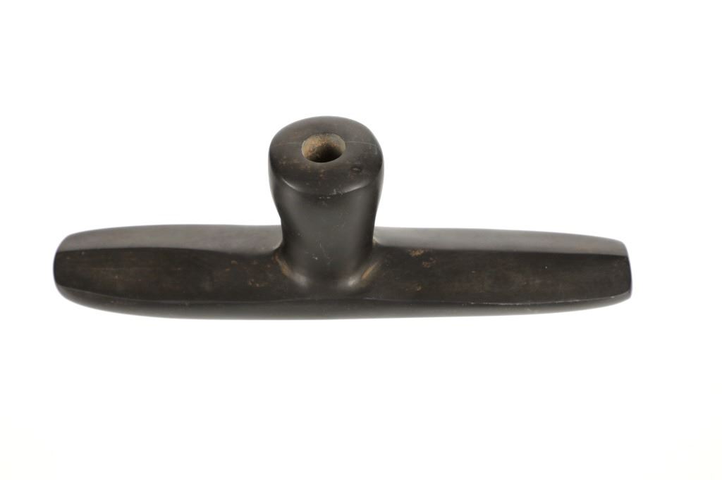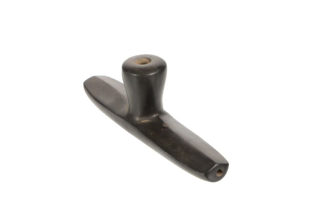 For your consideration is this Southern Plains Native American steatite "T" pipe originating from the 1800s. The pipe features hand carved steatite in the "T" style. The piece shows angled sides with a small hole for the stem and a larger hole on the top of the middle stem for tobacco and other herbs. The pipe is in very good condition with no signs of cracks or obvious damage present. The pipe measures 7 1/2" L x 1 1/2" W x 2 5/8" H.