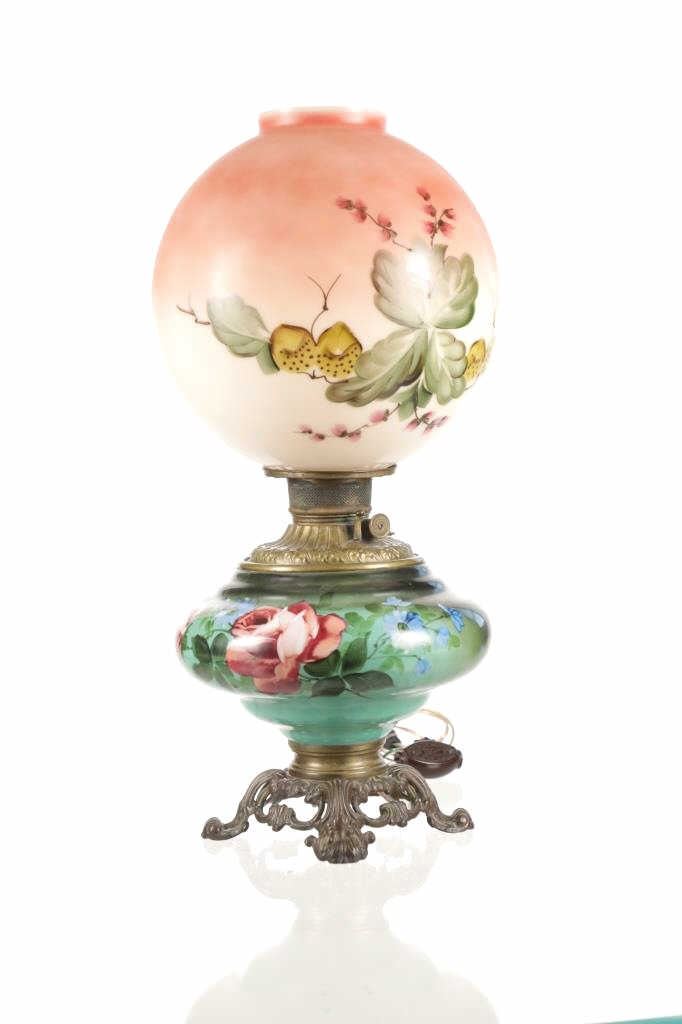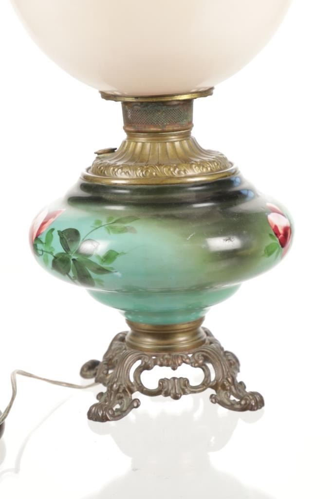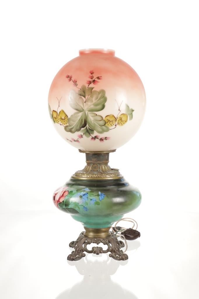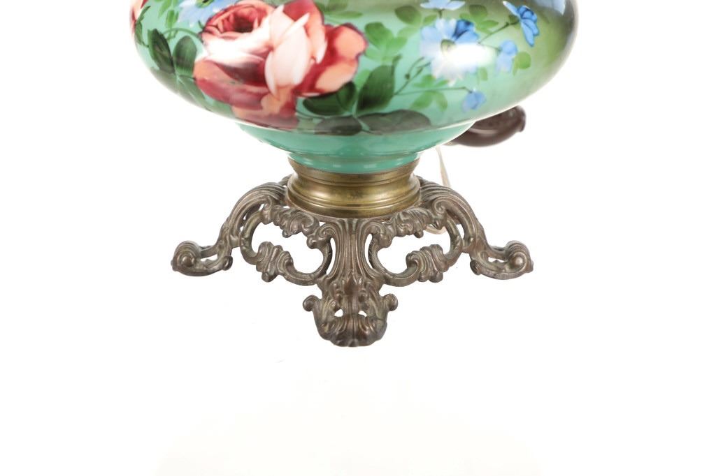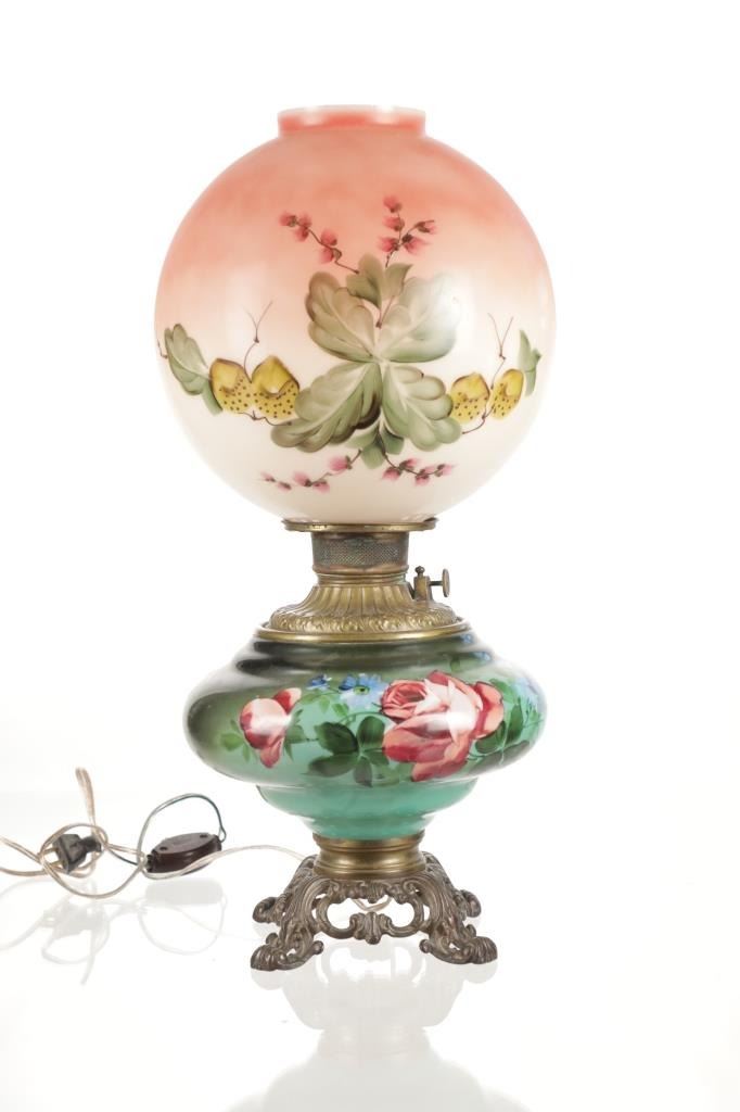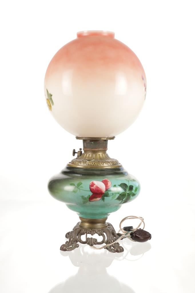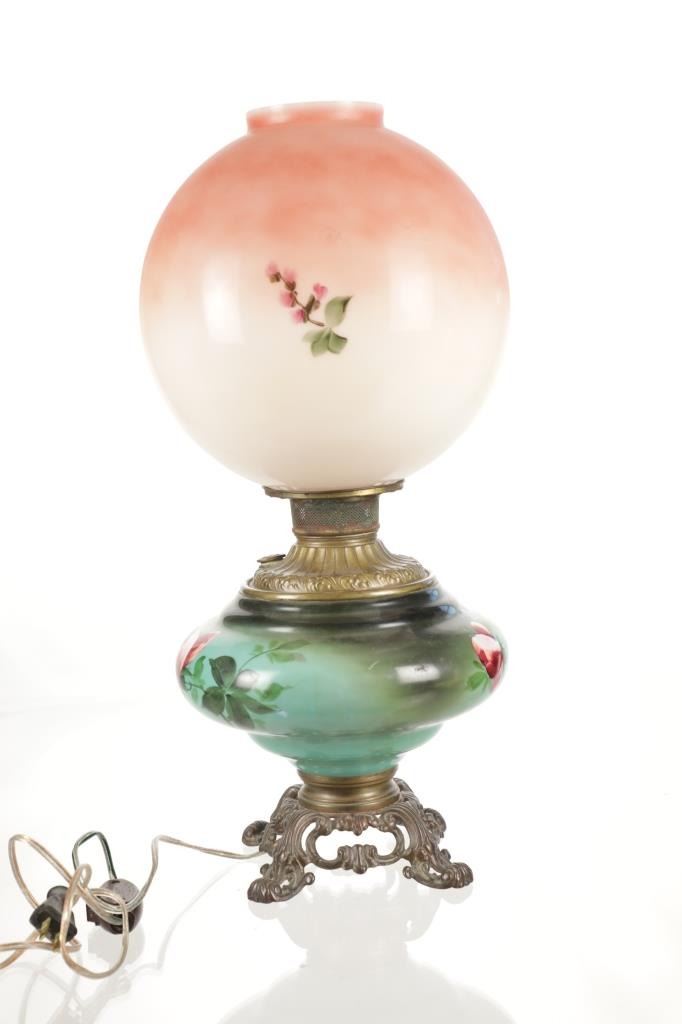 Featured in this lot is this circa 1800's floral Gone With The Wind oil lamp that has been electrified circa The Victorian Era and electrified in the early 1900's. The lamp features a wonderfully and professionally crafted glass and brass construction that shows hand painted decoration of the large upper globe with floral design and to the lower section globe shows roses and flowers to a green tinted glass. The lamp previously was set up for kerosene gas but have been refurbished to be lit up by electricity. The condition of this of this electrified hand painted lamp is good with no obvious signs of damage and shows good overall condition. The measurements of this table lamp is 24" x 9 1/2" x 9 1/2".